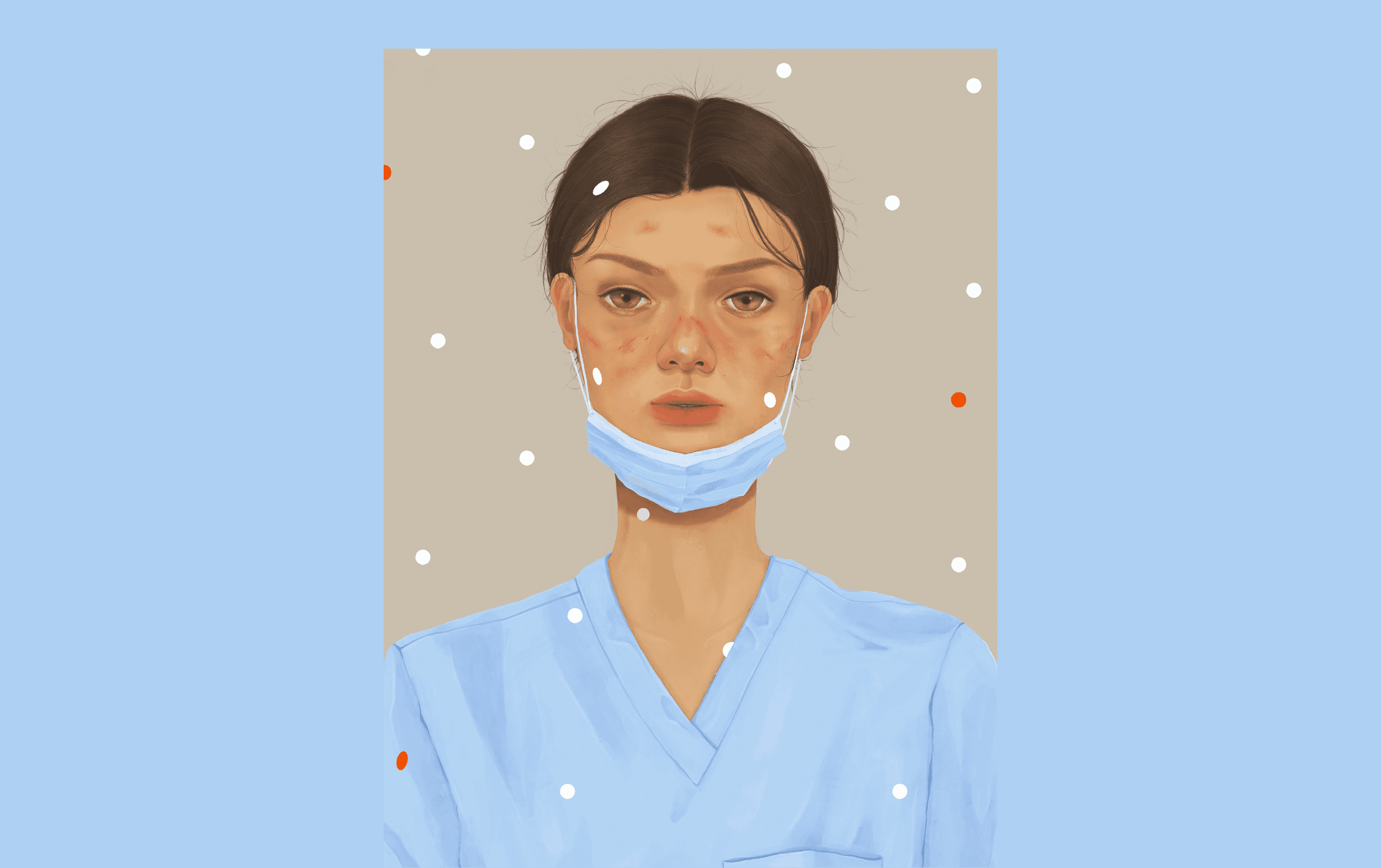 Airborne illustrates the physical toll of the pandemic through a portrait of a frontline hospital worker. The red dots represent the coronavirus and how airborne it is among the white dots.