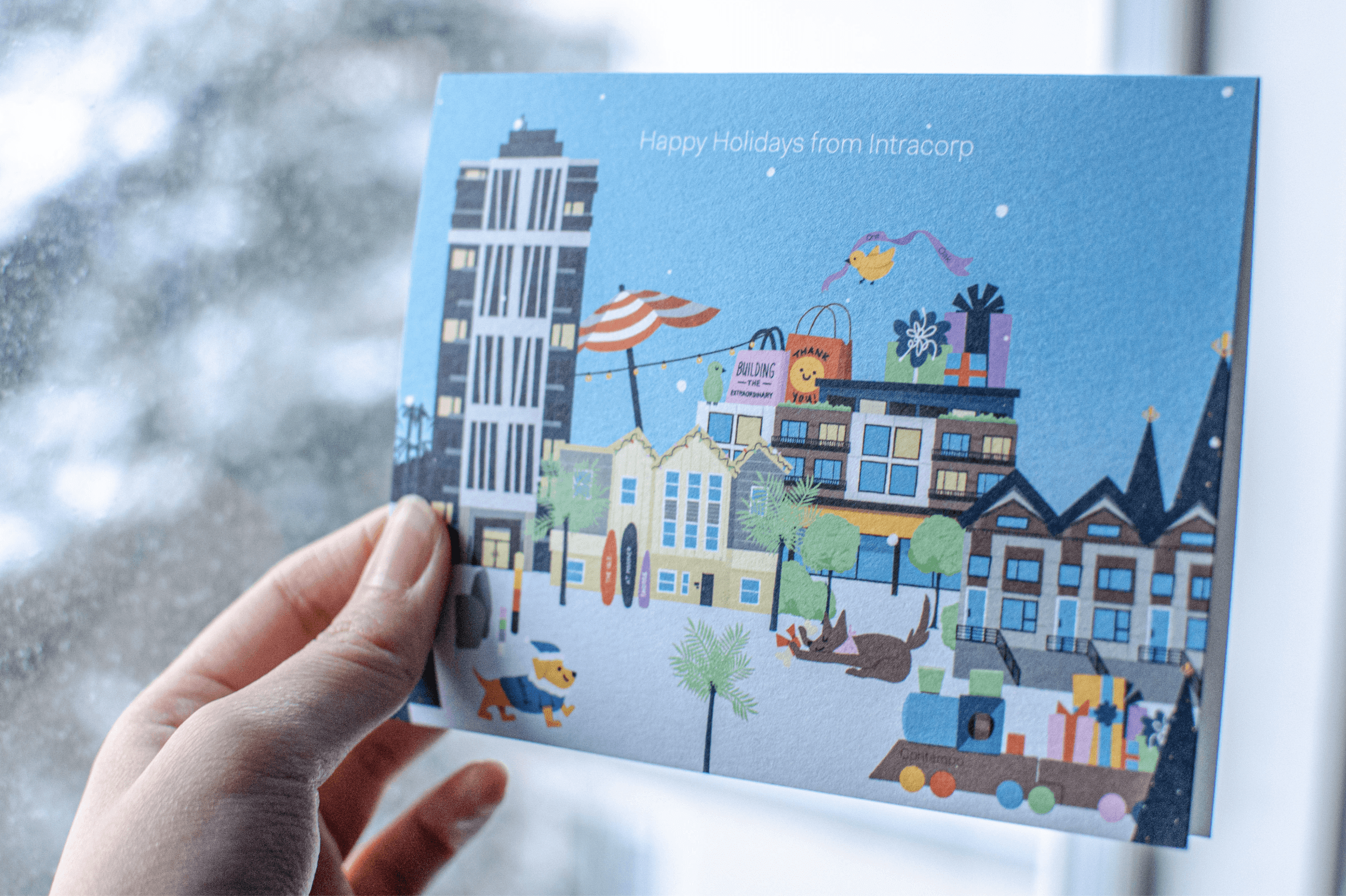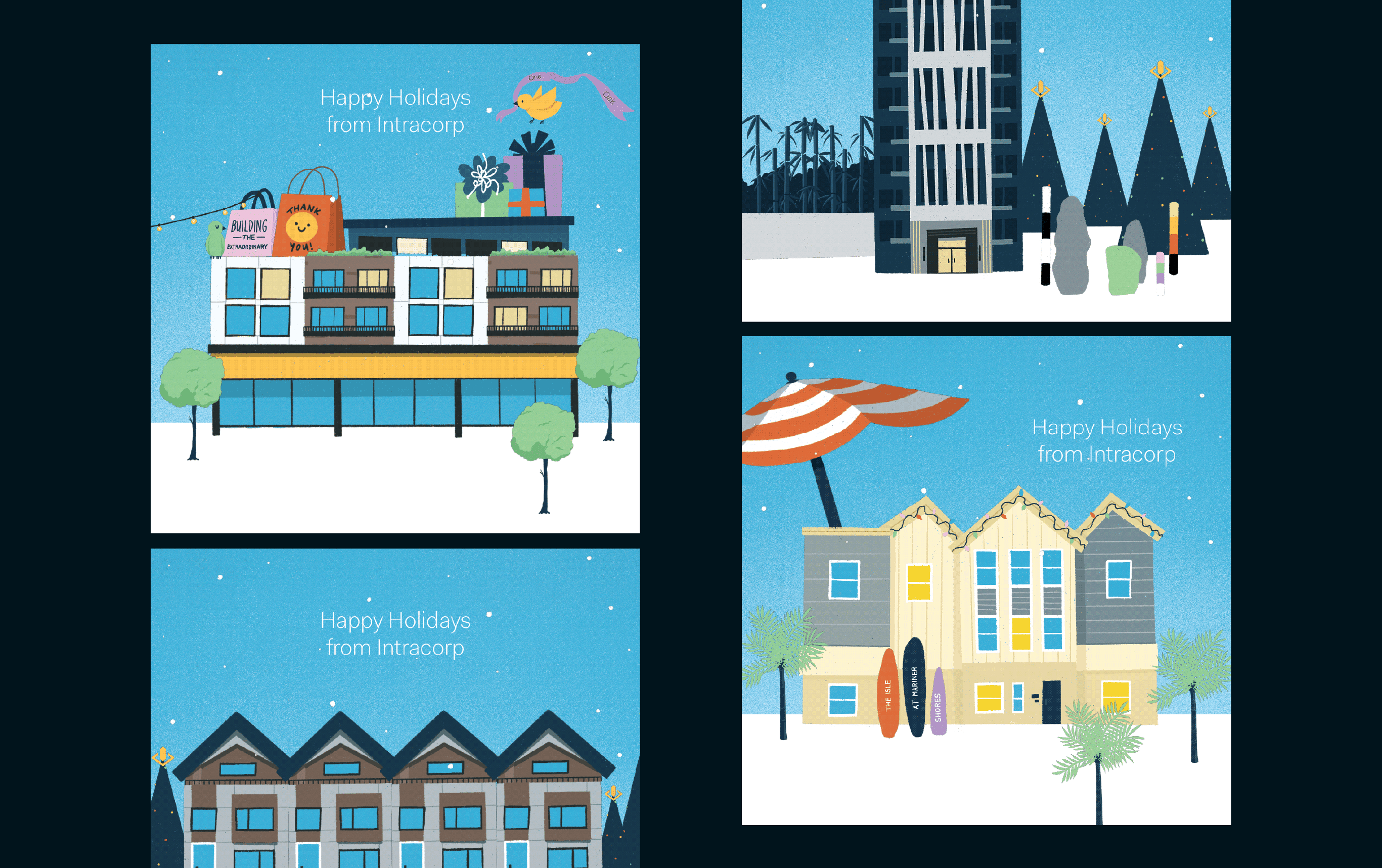 To celebrate the holidays, Intracorp wanted to create a holiday card that would showcase their newest buildings across North America–One Oak, Telford, Contempo, and The Isle at Mariner Shores.