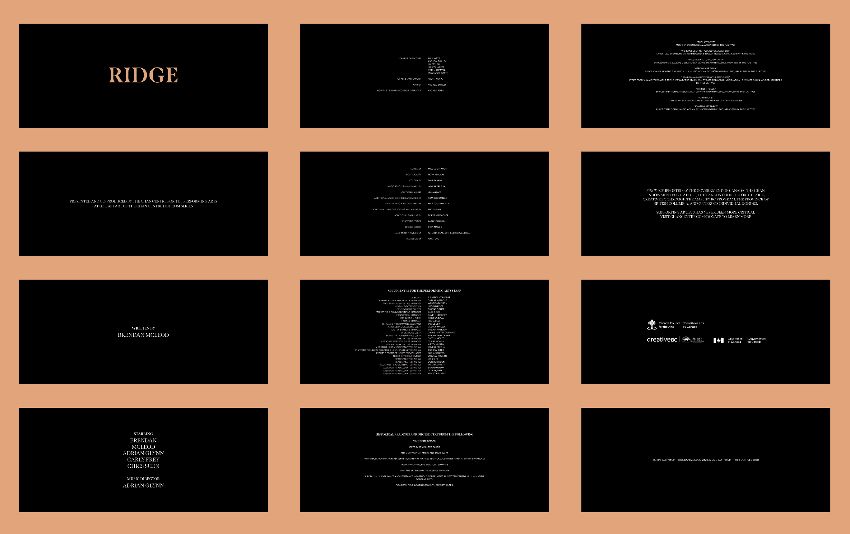 Originally conceived for a live audience in March 2020 and cancelled in the wake of the pandemic, Ridge has since been reimagined as a feature film. Shot on legendary Cooke Anamorphic lenses, the production transforms the Chan Centre for the Performing Arts into a world unto itself—drawing on its dressing rooms, soaring canopy, and orchestra pit as a dynamic, unconventional set. Brendan McLeod and his band The Fugitives shed every preconception of what a concert hall can be, allowing the venue to emerge as a character in its own right in this stunning cinematic adaptation of Ridge.